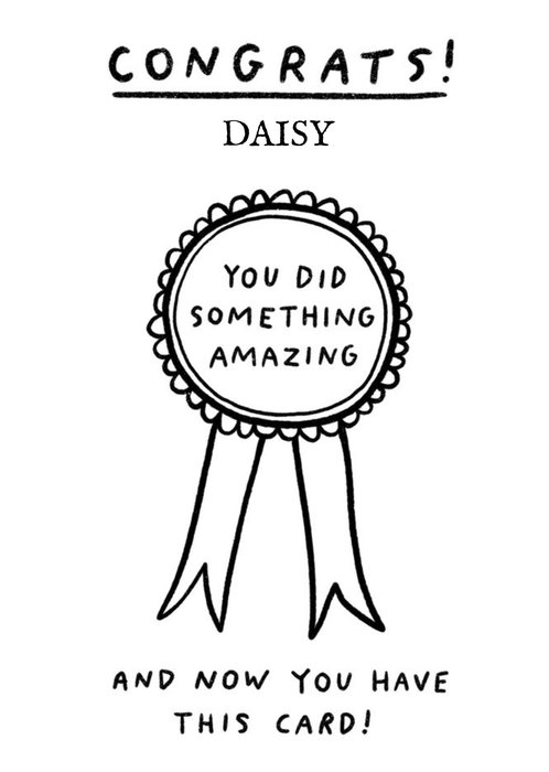 Front of card: Simple black line drawing of a rosette with handwritten text on a white background. Text reads:"Congrats! Daisy. You did something amazing and now you have this card!" With customisable name.