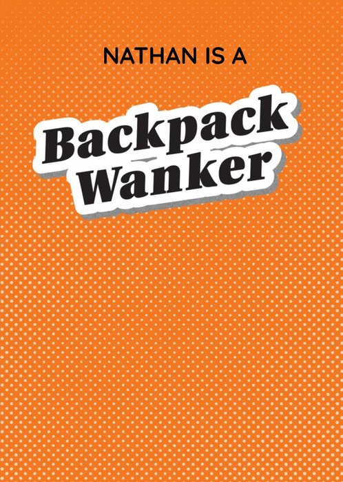 Front of card: Large black text on a white panel on an orange spotty background with editable name above. Text reads:"Nathan is a backpack wanker. With customisable name.