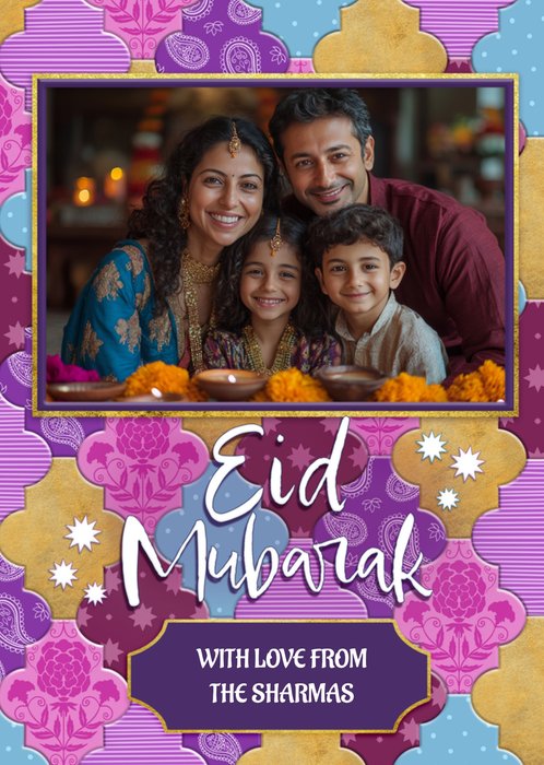 A vibrant, colourful design featuring one photo frame above hand lettered Eid greeting with white star icons and a gold bordered editable name plaque on a purple patterned background.