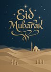 A warm, illustrative design featuring gold Eid Mubarak lettering with small stars above layered desert dunes and a mosque silhouette on a dark blue background