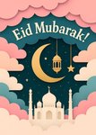 A colourful design featuring a layered pastel cloud frame around a night sky with a gold crescent moon, hanging lantern and star, plus a white mosque silhouette on a dark teal background.