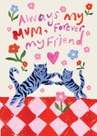 This charming Eleanor Bowmer Mother’s Day card features a hand-painted illustration of two playful blue cats, surrounded by flowers and a heartfelt message expressing love and friendship.