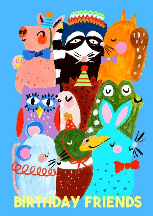 A colourful Eleanor Bowmer Birthday greeting card featuring a lively group of illustrated animal friends wearing party hats and accessories against a bright blue background, celebrating a birthday.