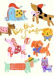 This ‘Eleanor Bowmer’ Christmas greeting card design features a variety of charming, whimsical dogs wearing festive accessories such as Santa hats, bows, and jumpers, illustrated in bold and vibrant colours, with the phrase “’Tis the Season” written in golden text on a cream background.