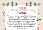 Inside of card: Ho ho ho, and a very Merry Christmas to you Archie. We are very busy here at the North Pole getting