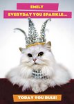 Front of card: Featuring a funny photograph of a cute cat wearing a tiara. Text reads: "Emily everyday you sparkle today you rule". All text can be personalised!