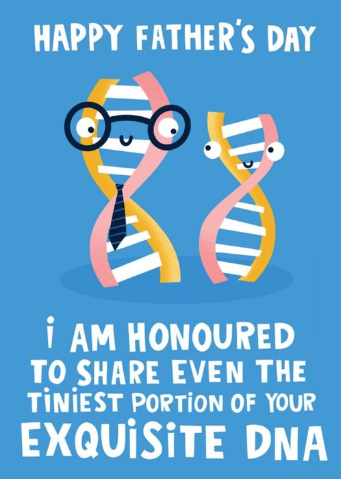 Front of card: Exquisite DNA Father's Day Card Humorous illustration of strands of DNA. Text reads: "Happy Father's Day I am honoured to share even the tiniest portion of your exquisite DNA".