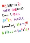 A vibrant and playful card featuring multicoloured hand-drawn text celebrating a fabulous Nanna. The message humorously compares her to a pink fairy poodle running through a field of daisies, making it a perfect choice for a fun and loving grandparent.