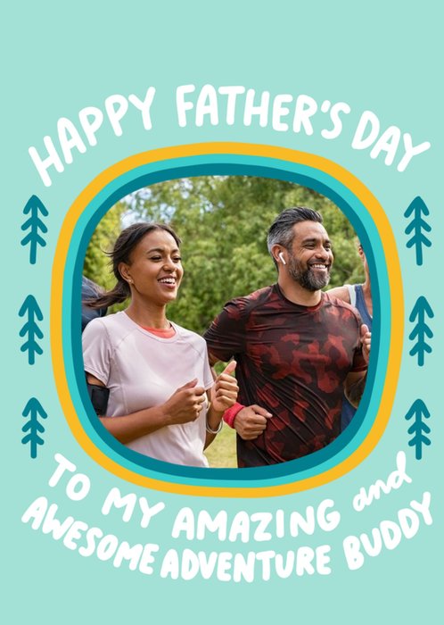 Front of card: Father's Day Photo Upload Card Outdoors themed illustration with six photo frames. Text reads: "Dad everyday is an awesome adventure with you".