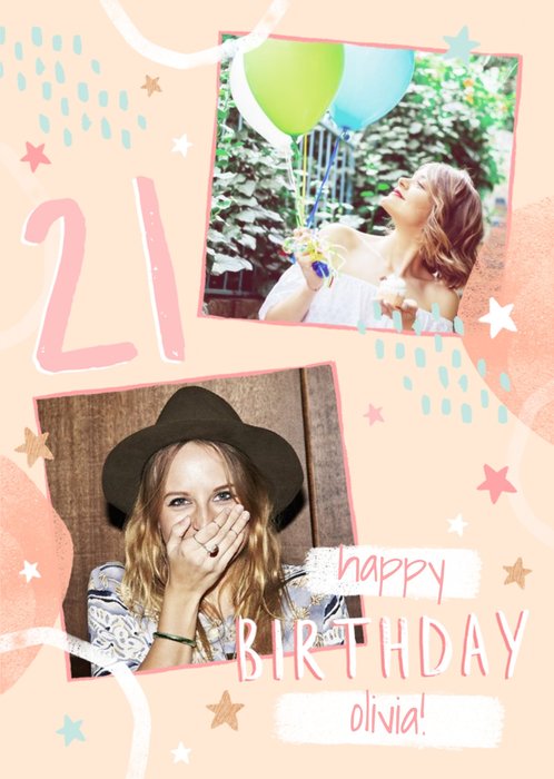 Front of card: 21st Birthday Photo Upload Card Featuring a two tone design with four photo frames. Text reads: "Happy 21st birthday Paige". 'Paige' can be personalised!