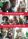 Front of card: A caring and minimal Christmas card featuring bold and clean typography. There are seven photo upload areas with overlapping illustrated Christmas holly and polka dots snow.