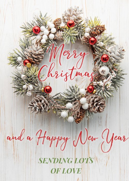 Featuring a photograph of a Christmas wreath including red and white baubles, conifer and pine cones on top of a mixture of foliage, it is sprayed with artificial snow. The wreath is attached to a wall of white wood.