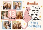 Front of card: Featuring an illustration of a leopard with a collage of six photo frames. Text reads: "13 today! Amelia today's your day to be fierce and fabulous happy birthday". 'Amelia' and '13' can be personalised!