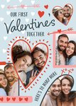 Front of card: Features a light blue background with doodle style illustrations of hearts and arrows and a mix of hand drawn heart shaped and rectangular photo upload frames. Amongst the photo frames is a mix of hand written style text.