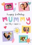 Front of card: Mummy Photo Upload Birthday Card Five colourful photo frames with handwritten typography. Text reads: "Happy birthday mummy love Milly & Cooper x". 'Love Milly & Cooper x' can be personalised!