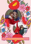 Front of card: Featuring an illustration of colourful vintage flowers with two circular photo frames. Text reads: "Happy birthday Katie". All text can be personalised!