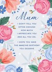 Front of card: Mum birthday message in the centre surrounded by painterly floral illustration in pinks, blues and oranges on a pale blue background. Text reads: "Mum. I don’t tell you enough how much I appreciate you and all you do. I hope you have the amazing birthday you deserve."