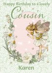 Front of card: Flower Fairies Lovely Cousin Birthday Card Traditional style, fairy and flowers. Green theme. Text reads: "Happy Birthday To A Lovely Cousin". Personalised name