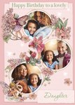 Front of card: Flower Fairies Lovely Daughter Photo Upload Birthday Card Traditional style, fairy and flowers. Pink theme with 3 photo uploads. Text reads: "Happy Birthday To A Lovely Daughter". Personalised name