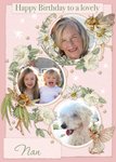 Front of card: Flower Fairies Lovely Nan Photo Upload Birthday Card Traditional style, fairy and flowers. Pink theme with 3 photo uploads. Text reads: "Happy Birthday To A Lovely Nan". Personalised name