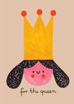 This cute greeting card design features a cartoon illustration of a smiling face with long hair topped by a large golden crown, accompanied by the handwritten phrase “for the queen” beneath, all set against a soft beige background, conveying a playful and affectionate message.