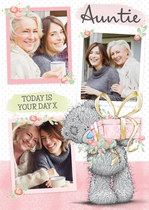 Four Photo Frames Surrounded By Colourful Watercolour Flowers Auntie's Photo Upload Birthday Card