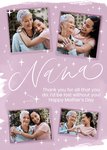 Front of card: Nana's Photo Upload Mother's Day Card Four photo frames with white calligraphy on a starry purple watercolour background. Text reads: "Nana thank you for all that you do. I'd be lost without you! Happy Mother's Day". 'Thank you for all that you do. I'd be lost without you! Happy Mother's Day' can be personalised!