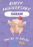 Front of card: Featuring an illustration of Monica's thanksgiving turkey. Text reads: "Happy anniversary Sarah! You're so great I love you". 'Sarah!' can be personalised!