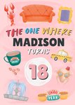 Front of card: Featuring iconic illustrations from American television sitcom Friends including a lobster, Monika's thanksgiving turkey and the Central Perk orange sofa. Text reads: "The one where Madison turns 18". 'Madison' can be personalised!