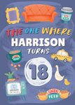 Front of card: Featuring iconic illustrations from American television sitcom Friends including a lobster, the chick and the duck and the Central Perk orange sofa. Text reads: "The one where Harrison turns 18". 'Harrison' can be personalised!