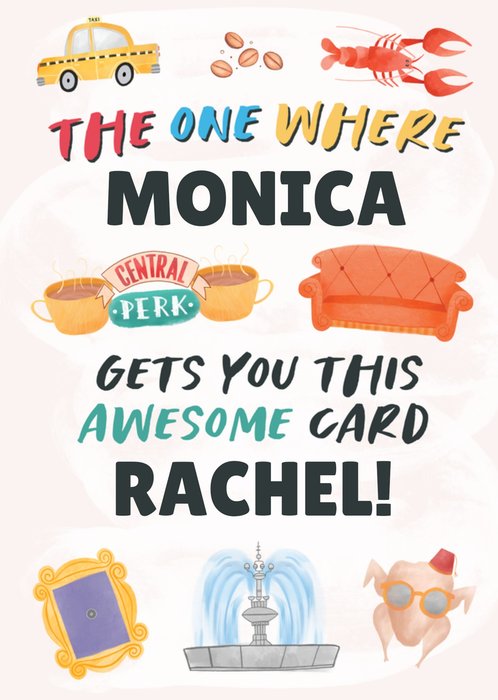 Front of card: Featuring iconic illustrations from American television sitcom Friends including a lobster, Monika's thanksgiving turkey and the Central Perk orange sofa. Text reads: "The one where Monika gets this awesome card Rachel". 'Monika' and 'Rachel' can be personalised!