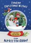 Front of card: Featuring an illustration of a snow globe with a photo frame nestled within. Text reads: "Sending Christmas wishes love from the Williams from across the globe!". 'Love from the Williams' can be personalised!