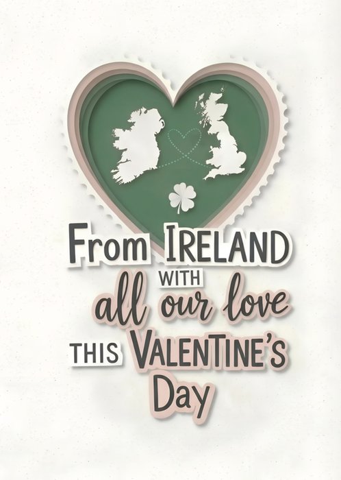 Featuring a green heart shaped stamp with white map silhouettes of Ireland and the UK linked by a dotted heart line and a small shamrock, with layered typography on a white background.
