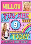 A fun and bold Photo Upload Birthday Day card featuring a hand-drawn comic strip layout with panels containing text and images, several of the different-sized rectangles include; bold handwritten block lettering, love hearts and a sun-shaped circle in the centre that holds the editable number. The design is in a bright, feminine colour palette. There are two photo upload areas inside their own panel in the comic strip layout.