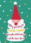 Front of card: A fun Christmas card featuring an illustration in the centre of Santa Claus with a tall red hat and a huge beard that encloses the main text of the card. There are snowballs and stars in the background.