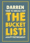 Front of card: Cream and yellow typography on blue background with border Text reads: "Darren time to break out the bucket list! #HappyRetirement" With editable name.<