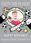 Front of Card: Fun illustrative scarf photo frame surrounded by footbals, stars and illustrated characters' Text reads: "FOOTY FAN OLIVER! HAPPY BIRTHDAY. Anytown United's Greatest Fan!" With editable name and team.