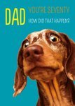 Front of card: Image of a sausage dog on a turquoise background with yellow, orange and white text above, Text reads: Dad You're Seventy. How did that happen? With customisable text options.
