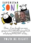 The card reads:"superstar son! oliver...if you thought you were going to laze around eating pizza and gaming all day...you'd be right!". "superstar son! oliver...if you thought you were going to laze around eating pizza and gaming all day" text is editable.