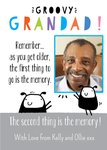 The card reads:"groovy grandad! remember... as you get older, the first thing to go is the memory. The second thing is the memory! with love from kelly and ollie xxx". "with love from kelly and ollie xxx" text is editable.