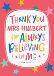 Front of card: Fun colourful typography design with stars on a red background Thank You card.Text reads: "Thank You Mrs Hulbert For Always Believing in Me From Cooper xx". Mrs Hulbert and From Cooper xx can be personalised.