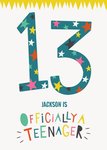 Front of Card: Fun, colourful design with yellow zig zag border at top. Big 13 with stars inside and typography in center on white background. Text reads: 13 JACKSON IS OFFICIALLY A TEENAGER With customisable name.