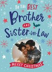 Front of card: Brother And Sister In Law Photo Upload Christmas Card Fun typography with a circular photo frame surrounded by snowflakes on a blue background. Text reads: "To the best brother and sister-in-law Merry Christmas".