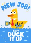 Featuring a humorous illustration of a yellow duck in water looking nervous. The duck is wearing a red tie and holding a mug and note book. There is text at the top and bottom of the card.