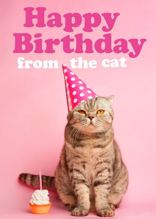 Humorous card featuring a tabby cat wearing a party hat sat next to a Birthday cupcake.