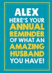 "ALEX HERE's YOUR ANNUAL REMINDER OF WHAT AN AMAZING HUSBAND YOU HAVE!" with editable name text.