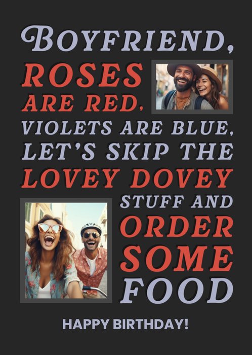 "Boyfriend, roses are red, violets are blue, let's skip the lovey dovey stuff and order some food. Happy Birthday!"