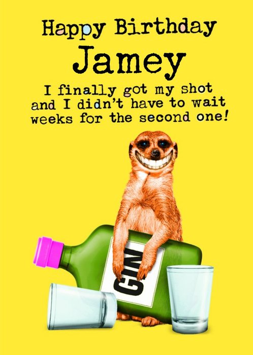 Meerkat holding a bottle of gin and two shot glasses. Personalised card. Text reads: "Happy Birthday. I Finally Got My Shot And I Didn't Have To Wait Weeks For The Second One"