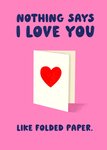 Featuring an illustration of a simple cream greeting card with a bold red heart on the front, paired with playful hand-drawn typography, on a pink coloured background.