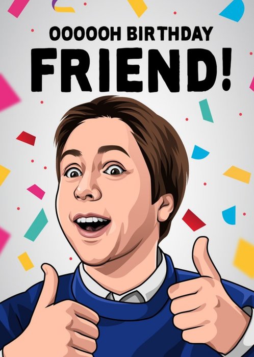 Front of card: Funny Oooooh Birthday Friend Card Illustrated spoof celebirty from tv show with thumbs up surrounded by confetti. Text reads: "Oooooh Birthday Friend"